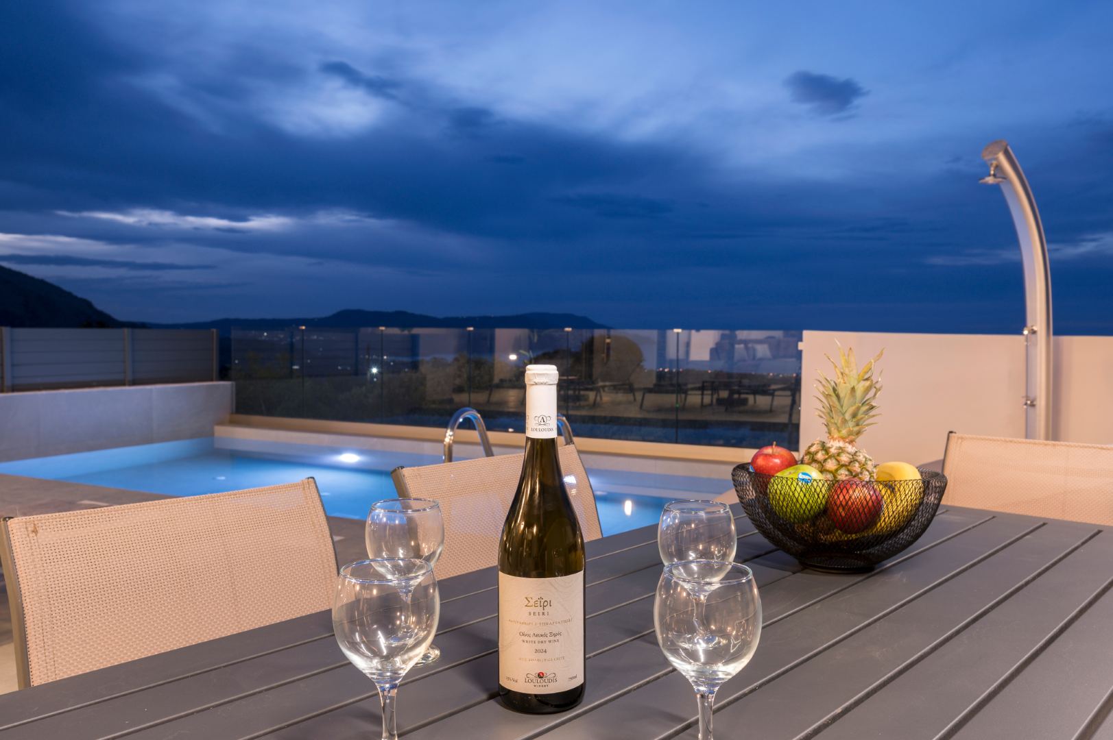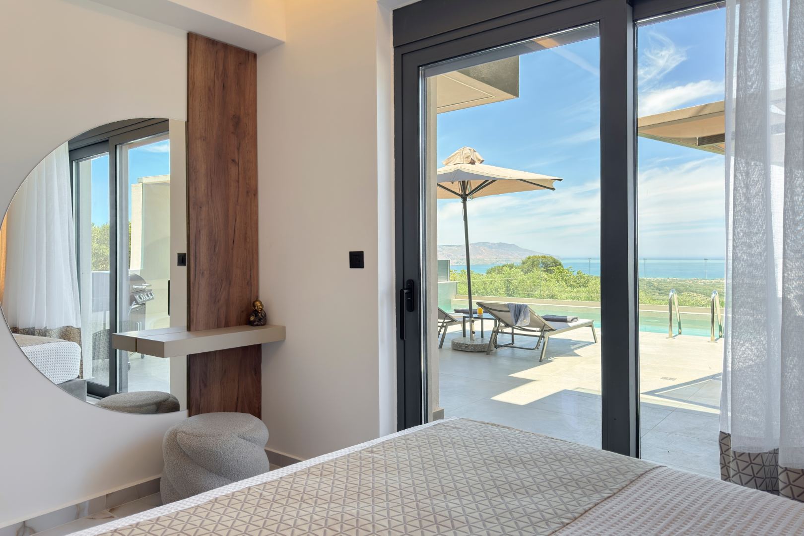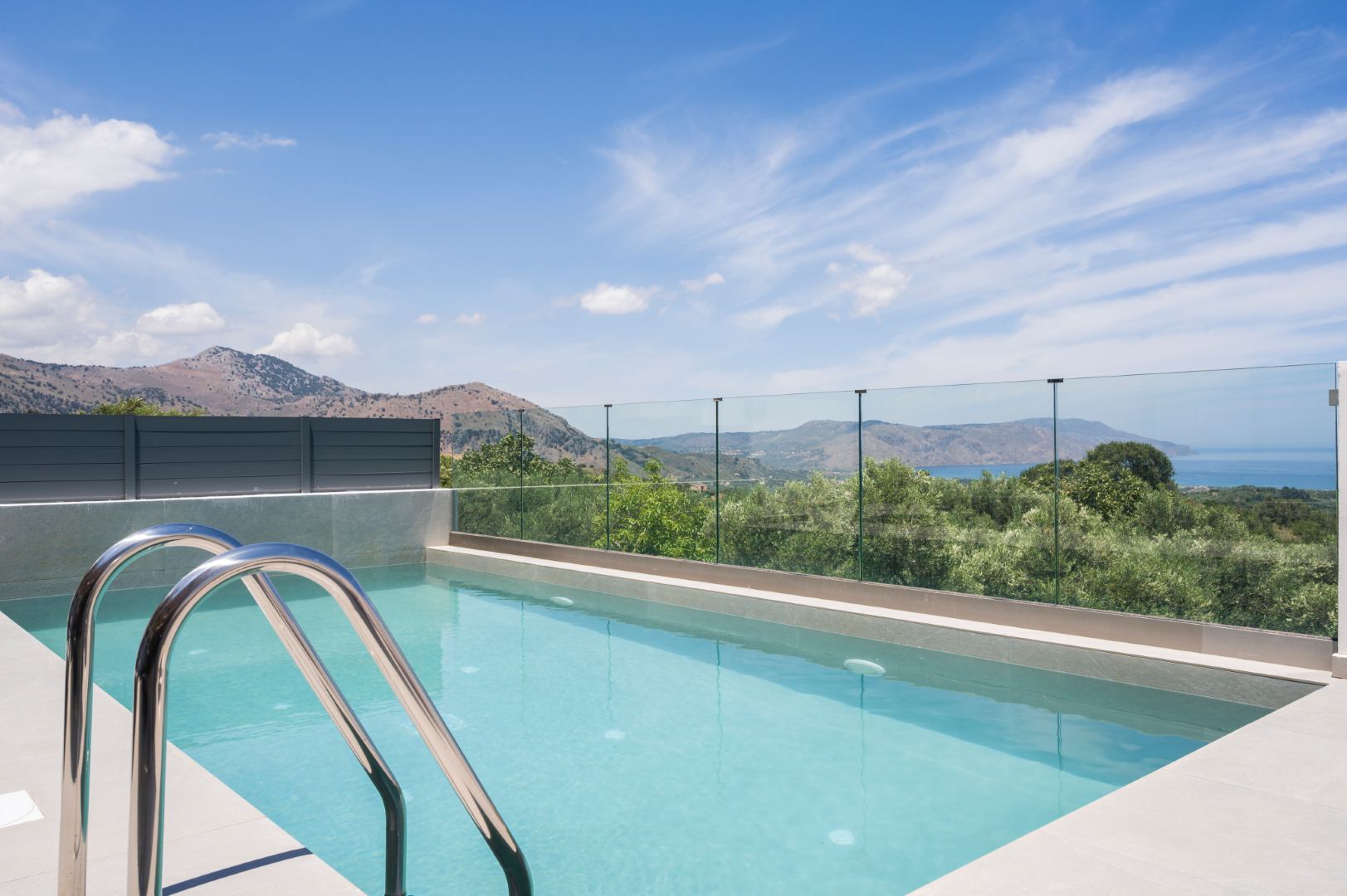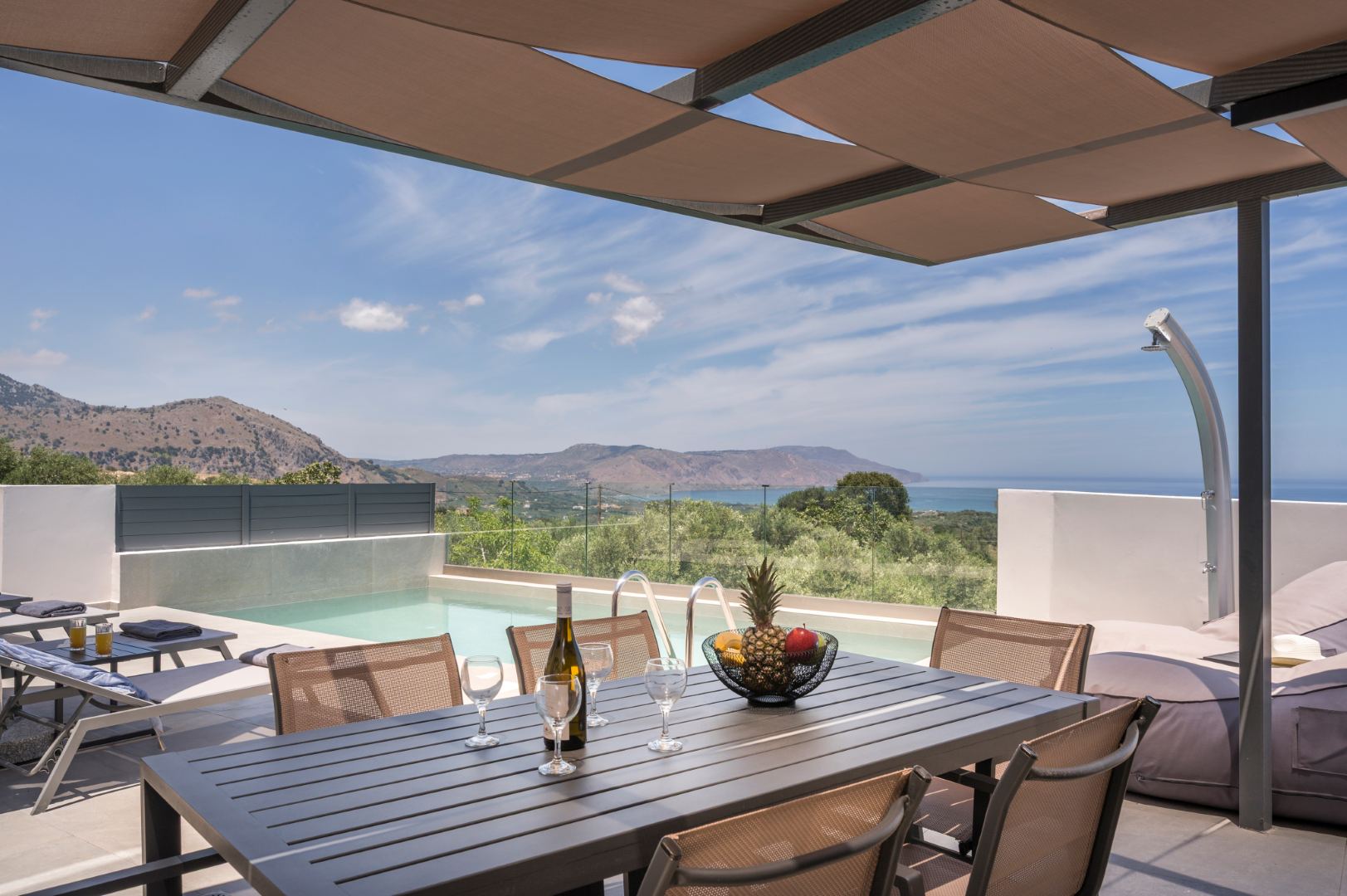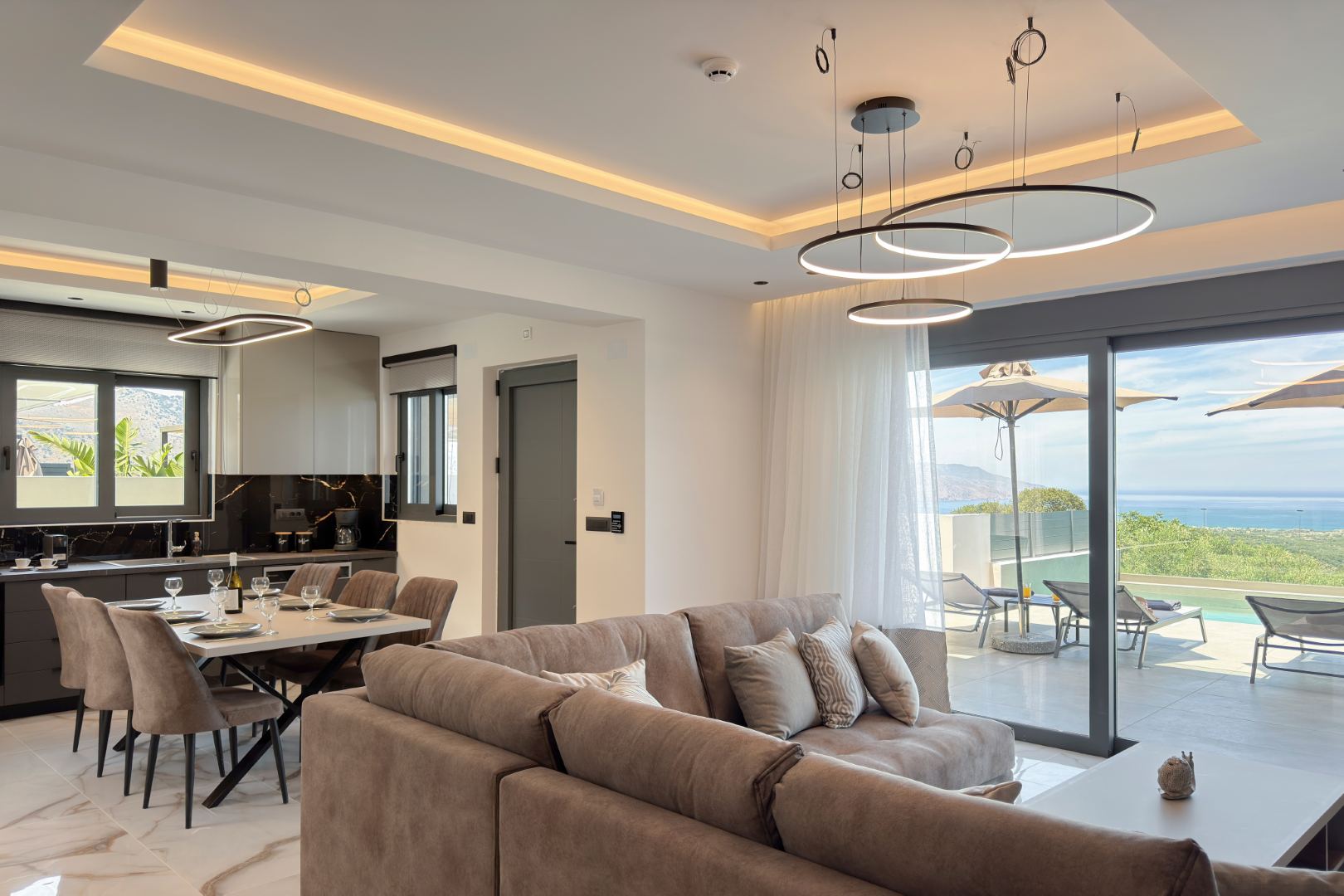 Horizon North Villa is the newest of the four and feels a bit like a stylish hideaway above the valley. The architecture is minimal and fresh, with straight lines, pale tones and lots of glass so the sea and the sky are always part of the view. Inside you have three comfortable bedrooms, two with queen size beds and one with twin beds, which makes the layout very flexible for families or friends travelling together. The open plan living area brings the kitchen, dining space and lounge all in one bright room that opens directly to the pool terrace, so you can move in and out without thinking about it. Outside, the private pool, sun loungers and barbecue corner create a relaxed outdoor living area where most guests end up spending most of the day. Horizon North Villa works very well if you want a modern base with a quiet, almost retreat like feeling but still close to the lake, the beaches and small Cretan villages.