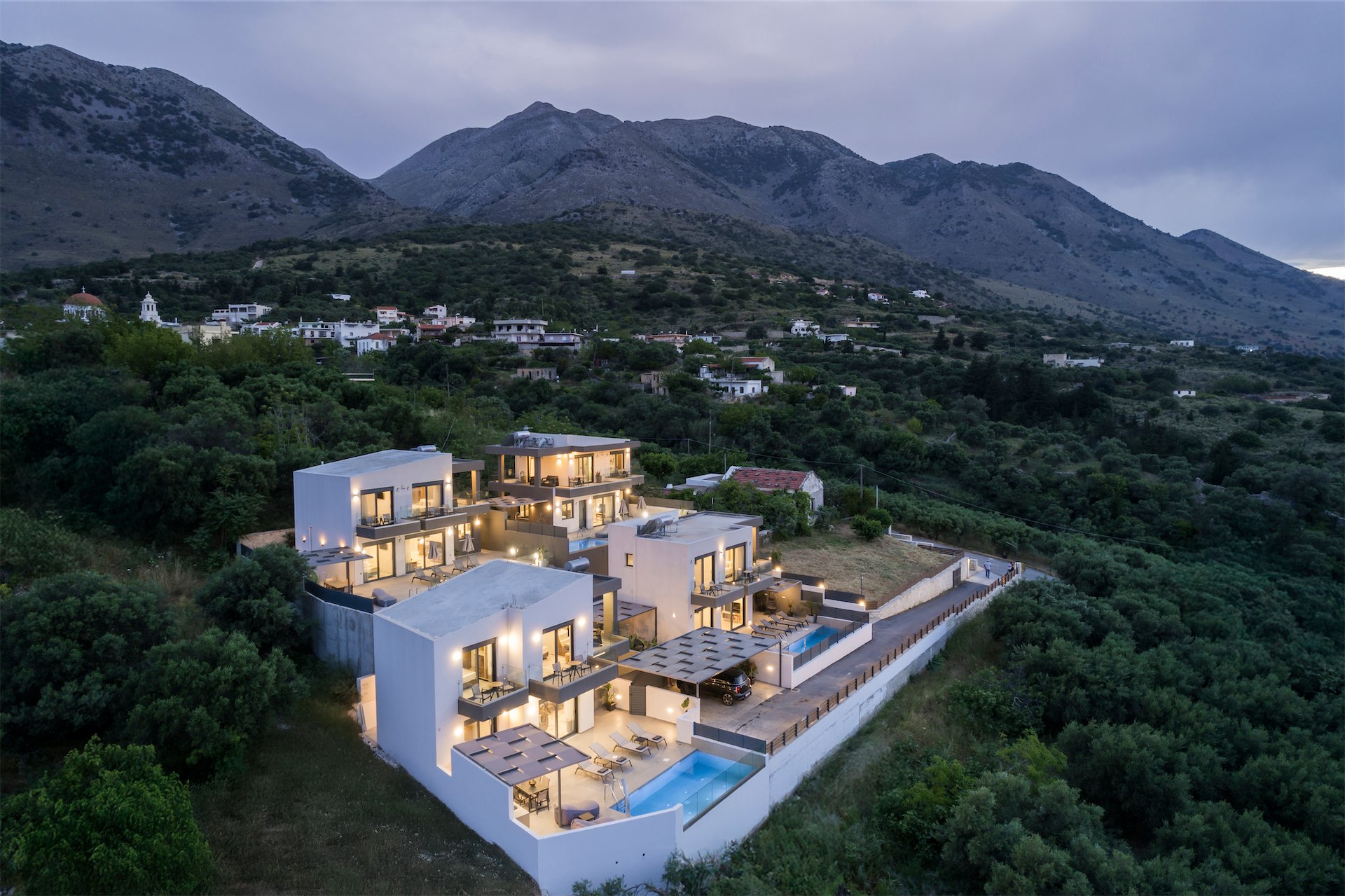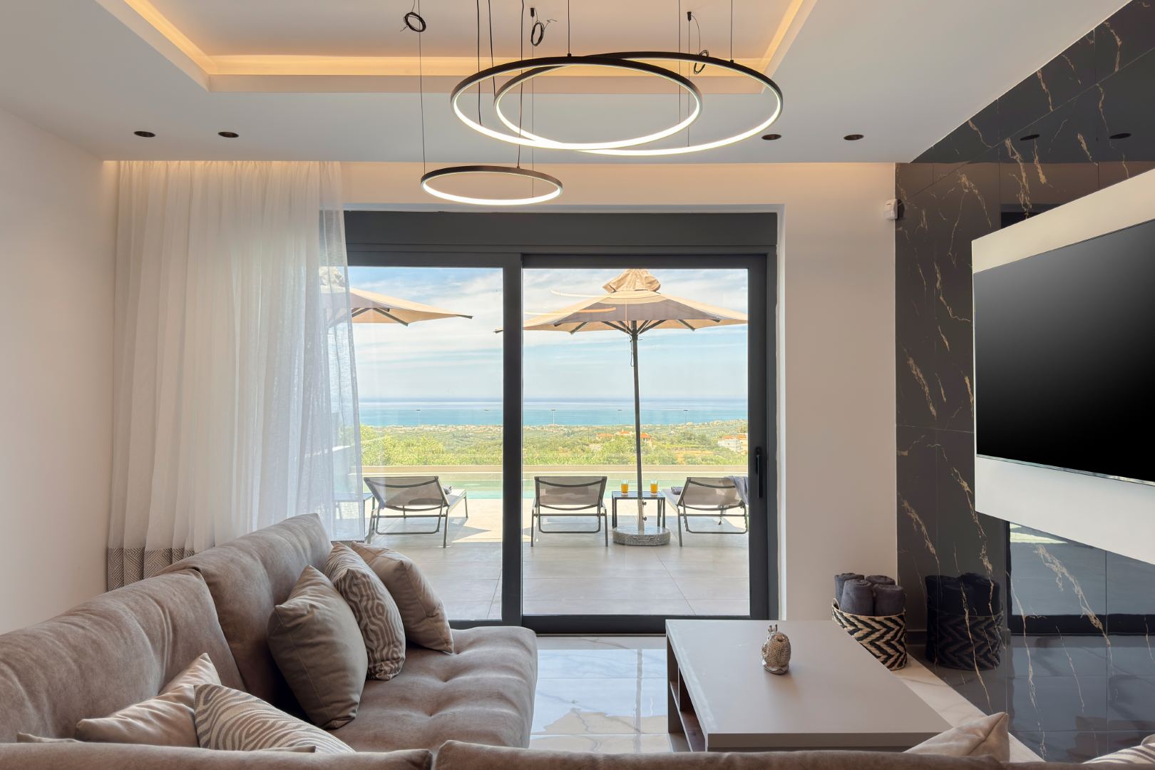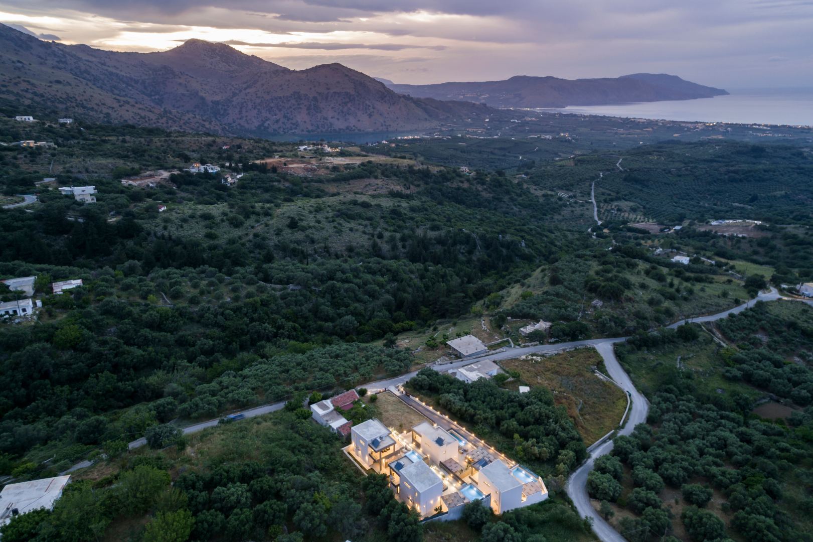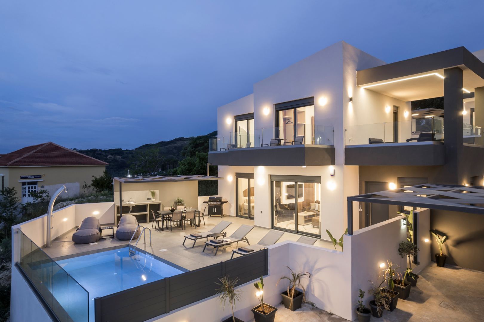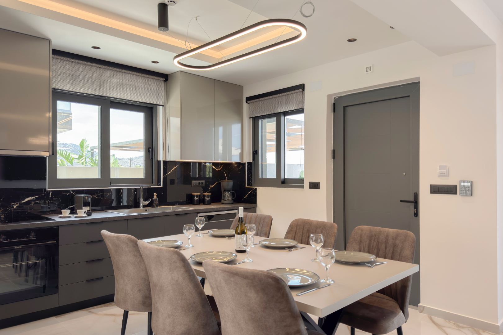 Horizon North Villa is the newest of the four and feels a bit like a stylish hideaway above the valley. The architecture is minimal and fresh, with straight lines, pale tones and lots of glass so the sea and the sky are always part of the view. Inside you have three comfortable bedrooms, two with queen size beds and one with twin beds, which makes the layout very flexible for families or friends travelling together. The open plan living area brings the kitchen, dining space and lounge all in one bright room that opens directly to the pool terrace, so you can move in and out without thinking about it. Outside, the private pool, sun loungers and barbecue corner create a relaxed outdoor living area where most guests end up spending most of the day. Horizon North Villa works very well if you want a modern base with a quiet, almost retreat like feeling but still close to the lake, the beaches and small Cretan villages.