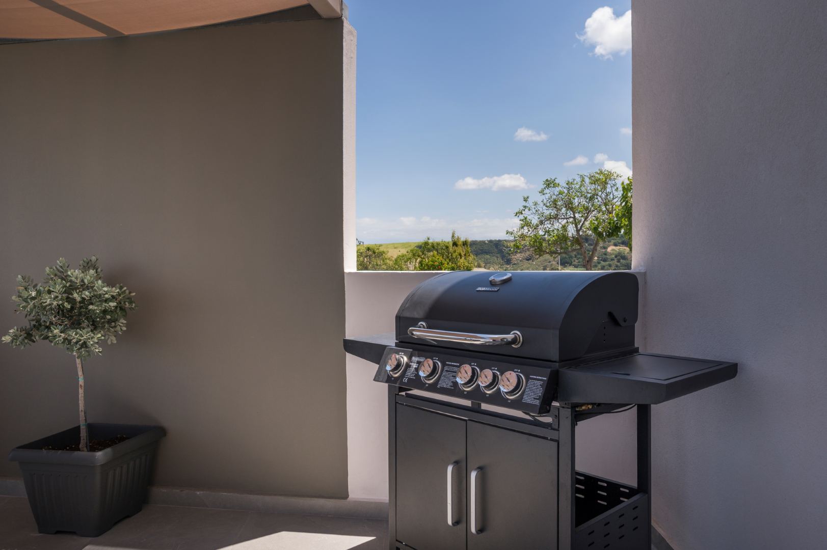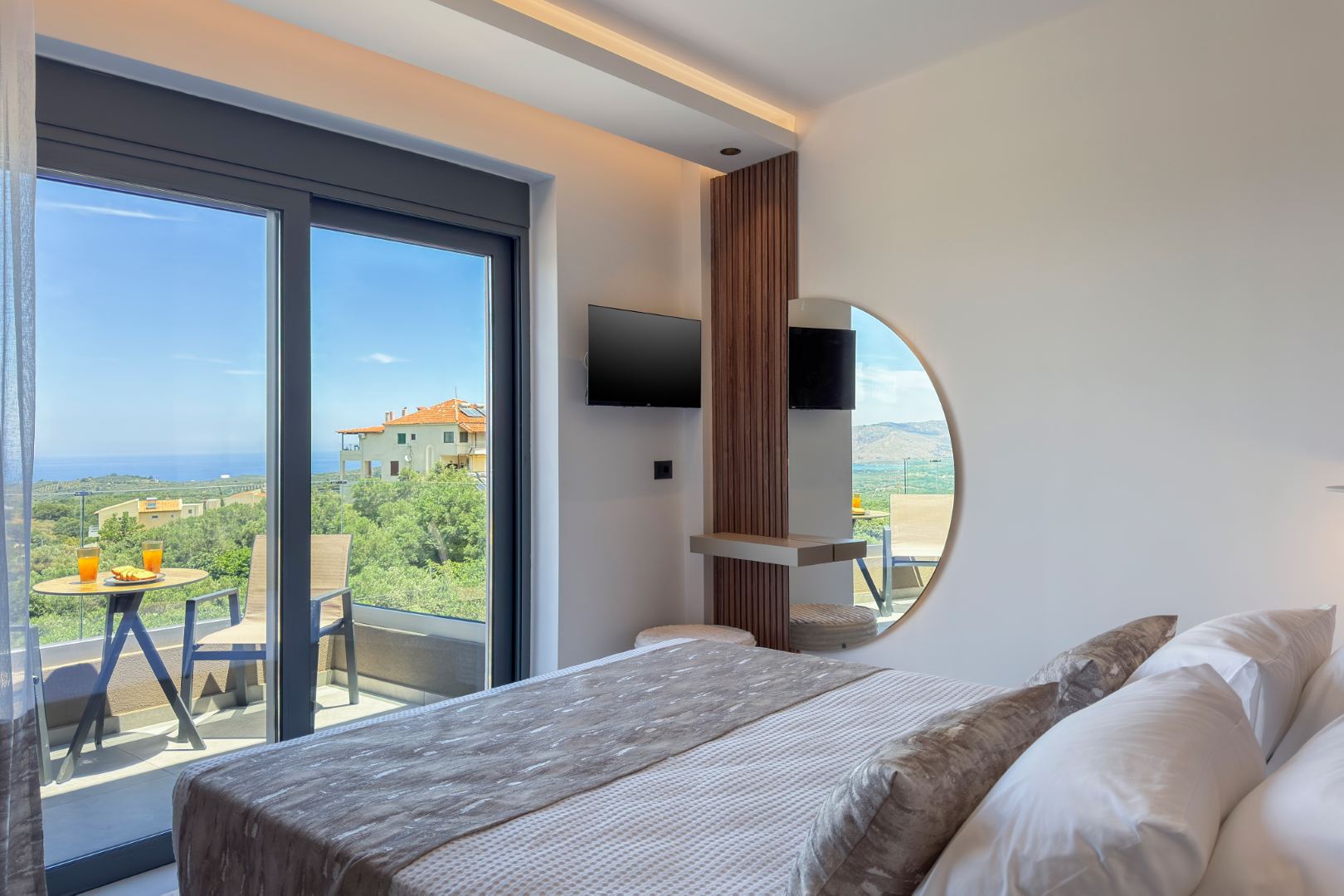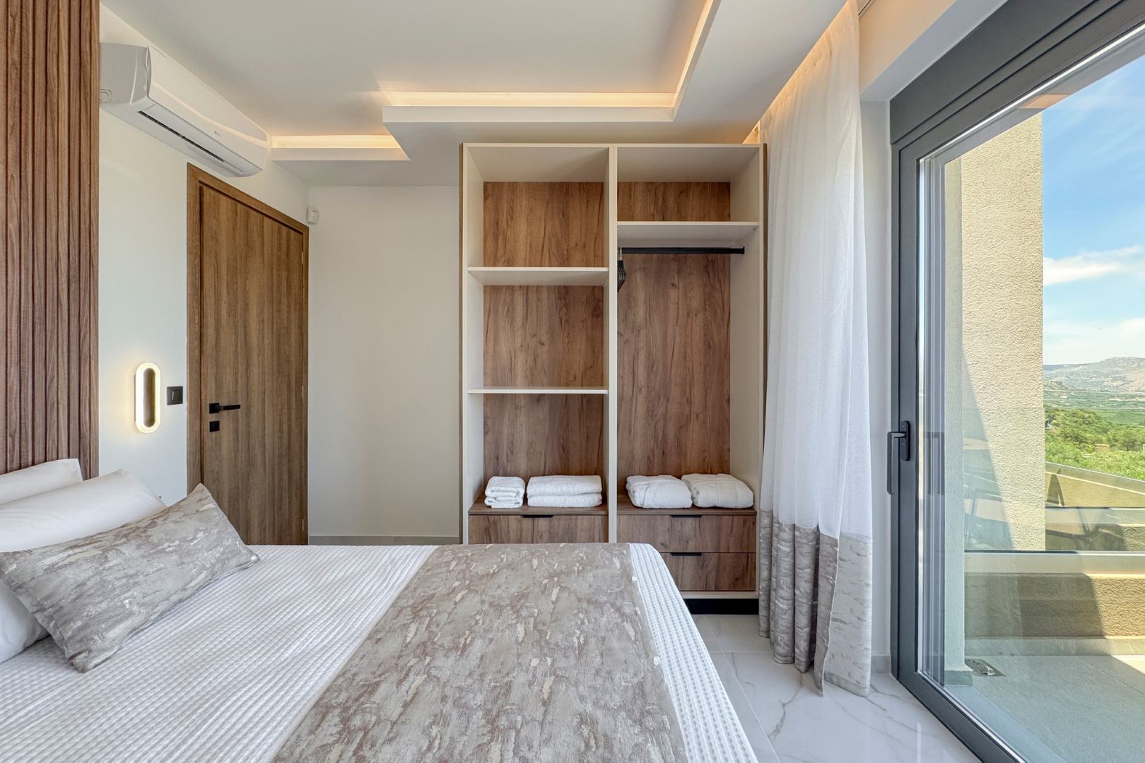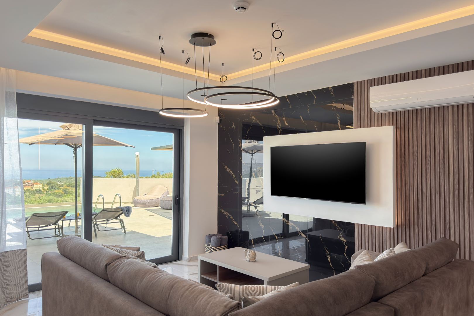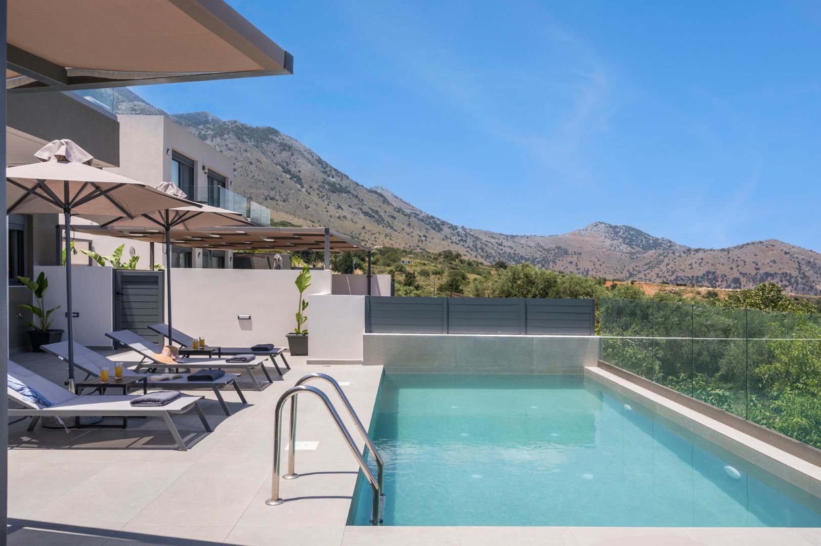 Horizon North Villa is the newest of the four and feels a bit like a stylish hideaway above the valley. The architecture is minimal and fresh, with straight lines, pale tones and lots of glass so the sea and the sky are always part of the view. Inside you have three comfortable bedrooms, two with queen size beds and one with twin beds, which makes the layout very flexible for families or friends travelling together. The open plan living area brings the kitchen, dining space and lounge all in one bright room that opens directly to the pool terrace, so you can move in and out without thinking about it. Outside, the private pool, sun loungers and barbecue corner create a relaxed outdoor living area where most guests end up spending most of the day. Horizon North Villa works very well if you want a modern base with a quiet, almost retreat like feeling but still close to the lake, the beaches and small Cretan villages.