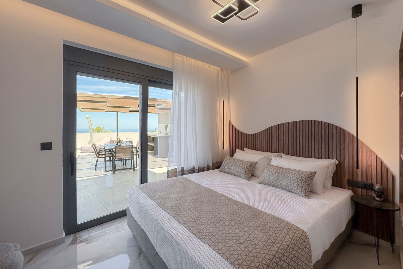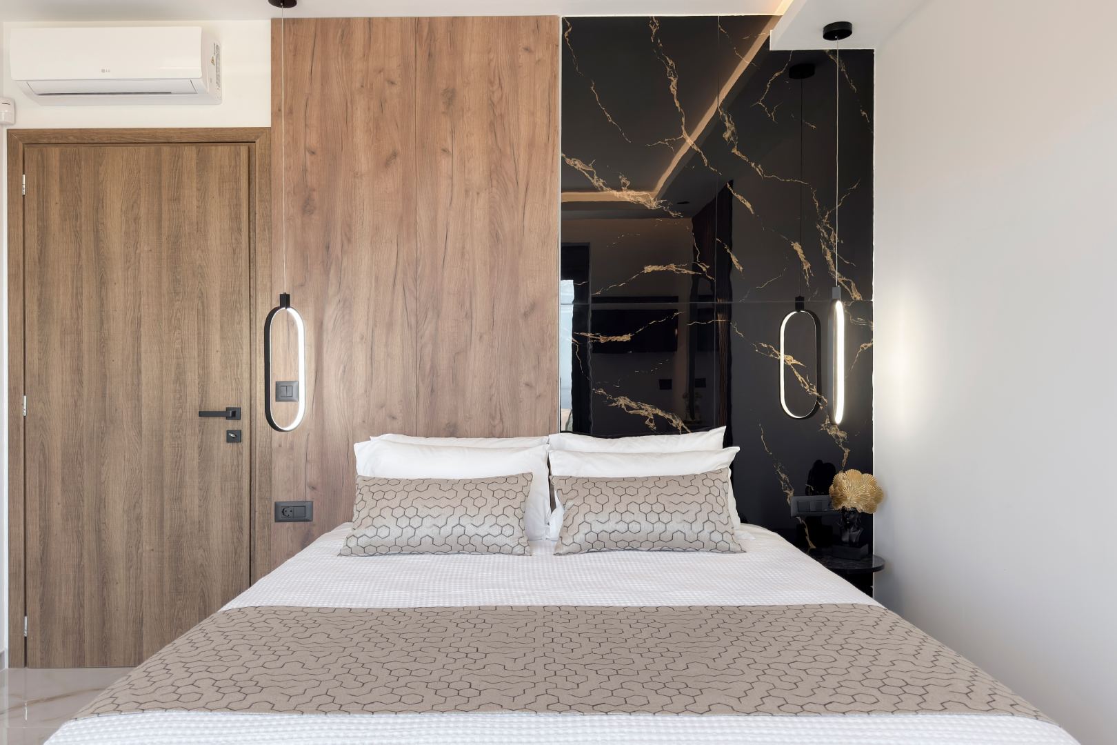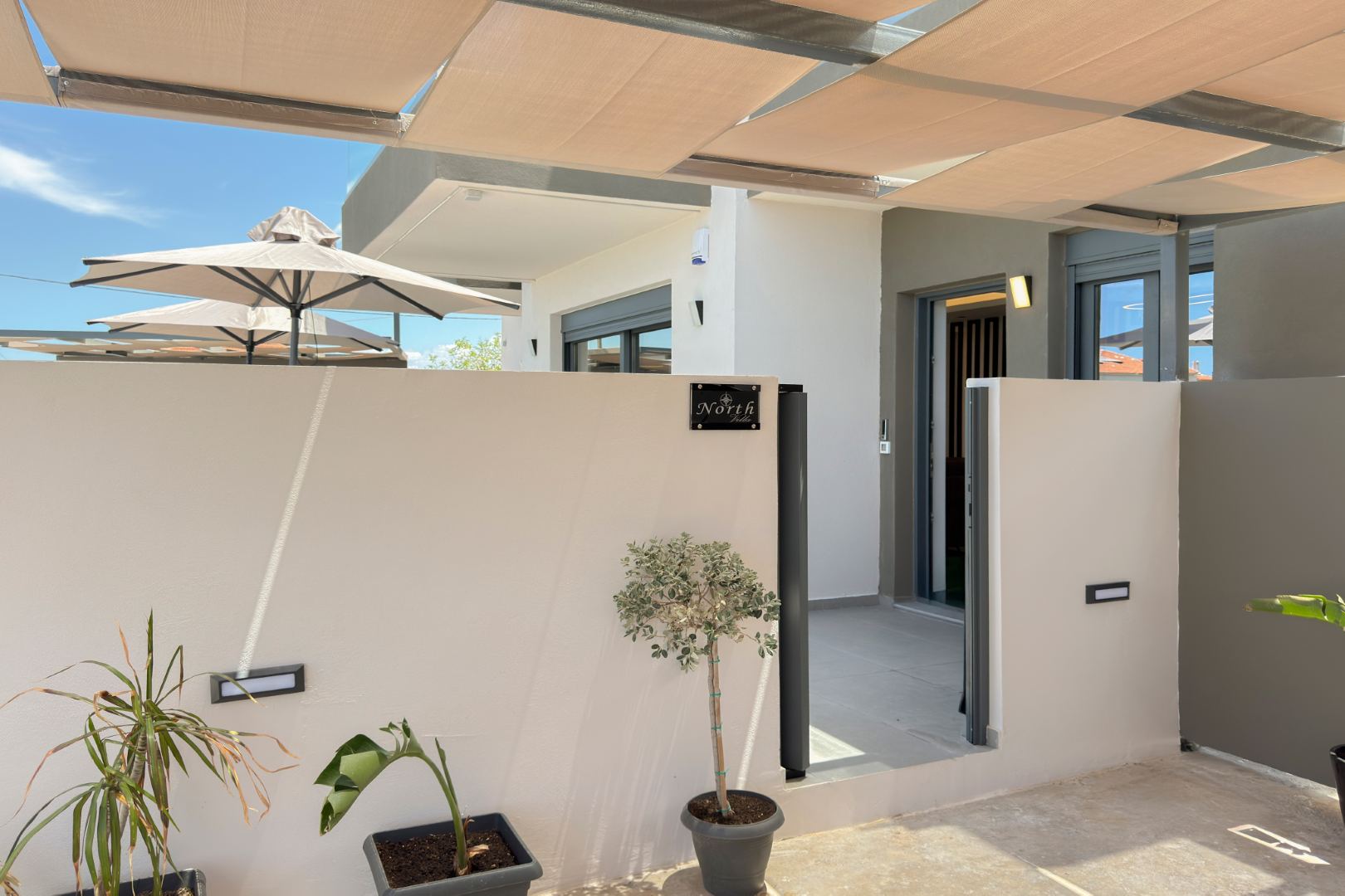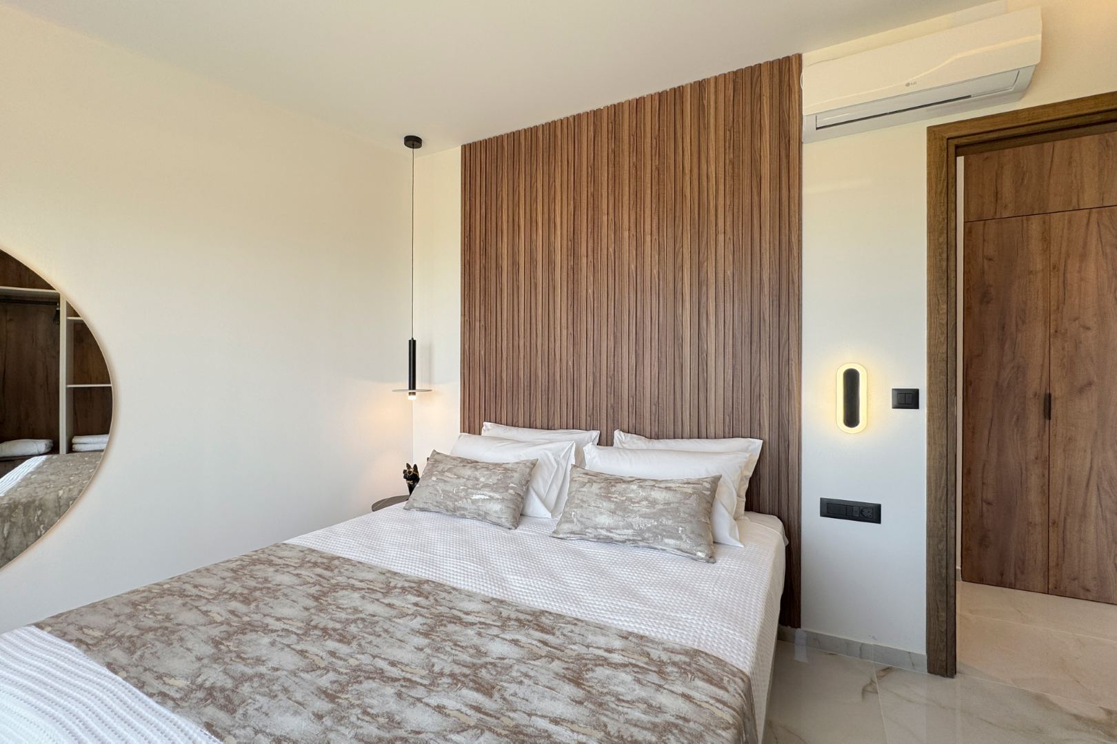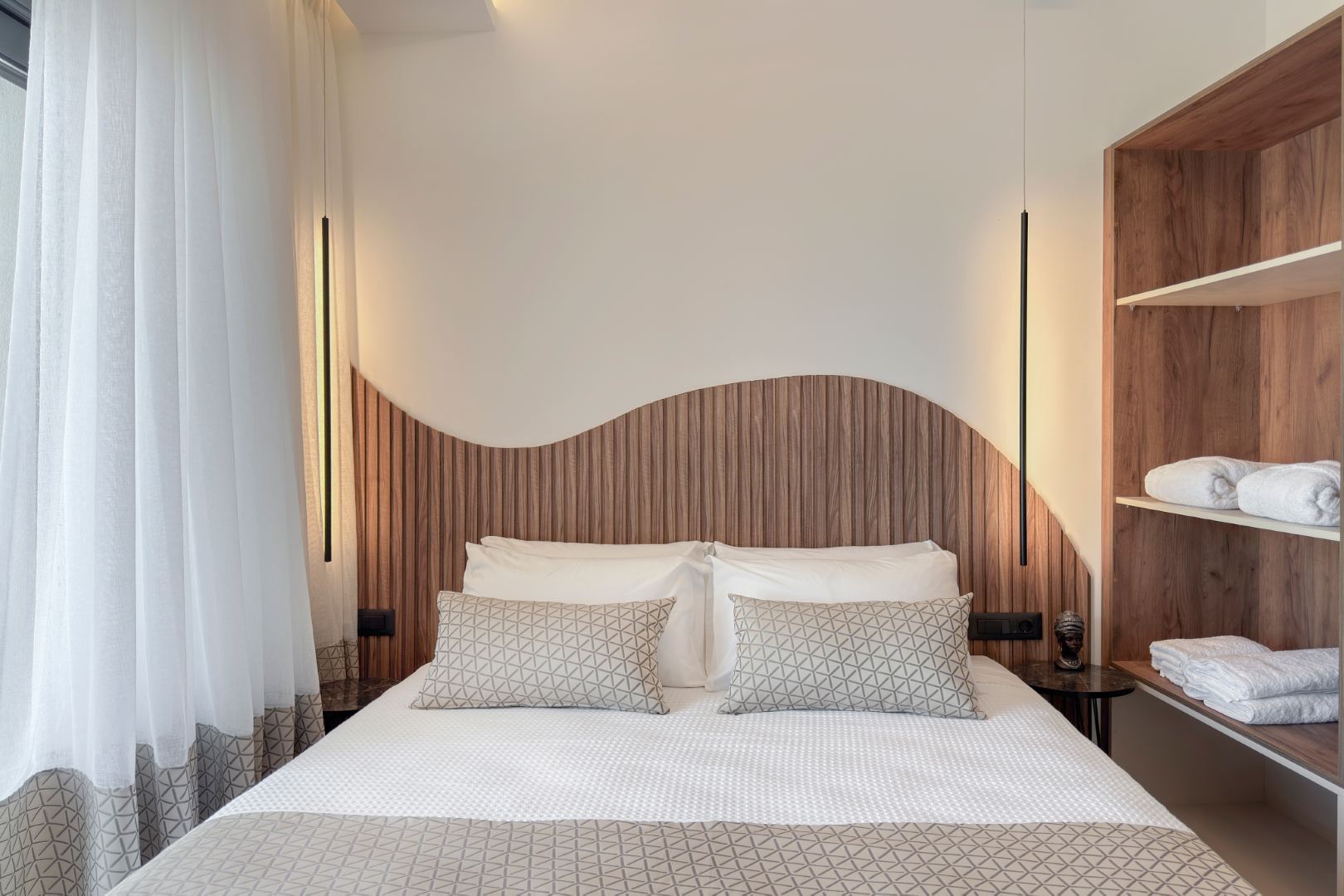 Horizon North Villa is the newest of the four and feels a bit like a stylish hideaway above the valley. The architecture is minimal and fresh, with straight lines, pale tones and lots of glass so the sea and the sky are always part of the view. Inside you have three comfortable bedrooms, two with queen size beds and one with twin beds, which makes the layout very flexible for families or friends travelling together. The open plan living area brings the kitchen, dining space and lounge all in one bright room that opens directly to the pool terrace, so you can move in and out without thinking about it. Outside, the private pool, sun loungers and barbecue corner create a relaxed outdoor living area where most guests end up spending most of the day. Horizon North Villa works very well if you want a modern base with a quiet, almost retreat like feeling but still close to the lake, the beaches and small Cretan villages.